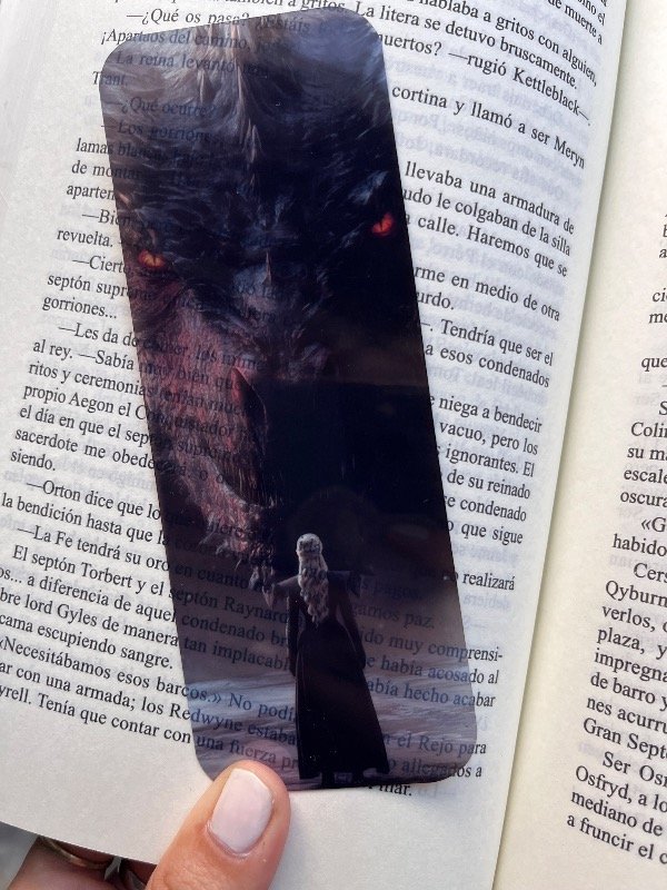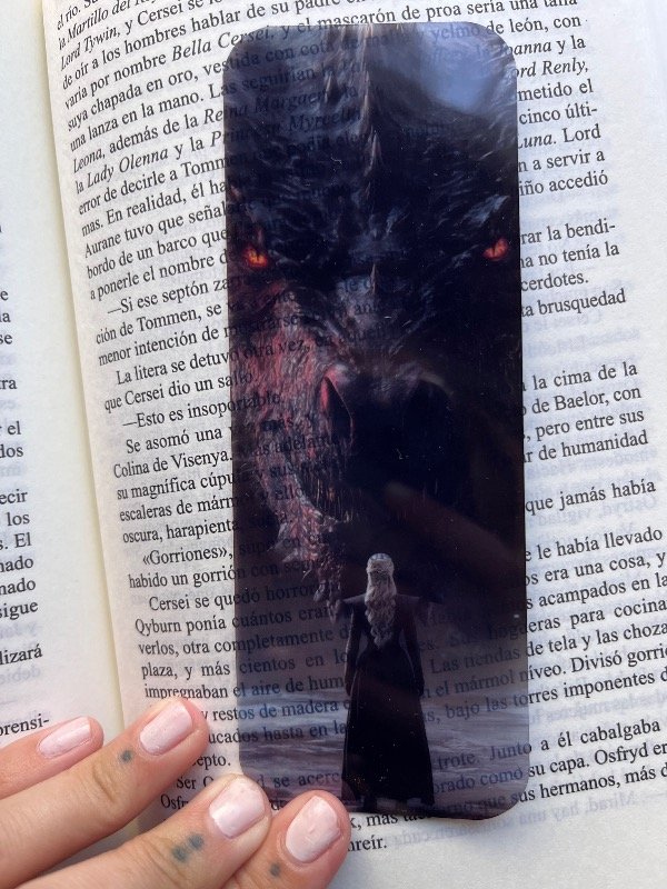 Señalador de material translúcido y plastificado, con diseño de un libro con anteojos y de fondo un disco de Vinilo.