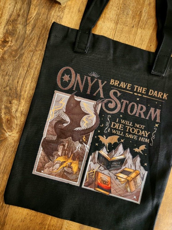 Tote bag de gabardina negra, con estampa en Dtf. Diseño de Onyx Storm, saga Empíreo.