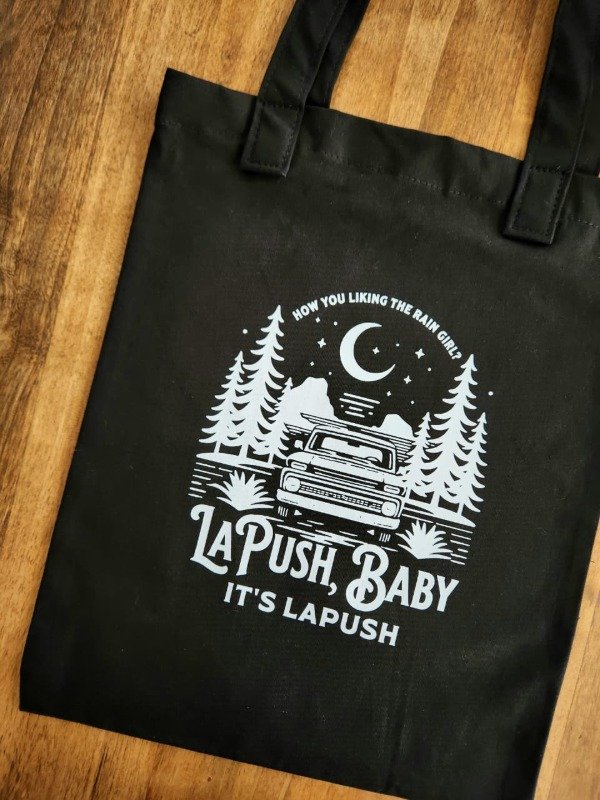 Tote bag de gabardina negra, con estampa en Dtf. Diseño de La push, saga de Crepúsculo.