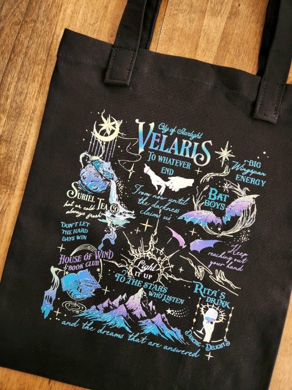 Tote bag de gabardina negra, con estampa en Dtf. Diseño de Velaris, saga Acotar.